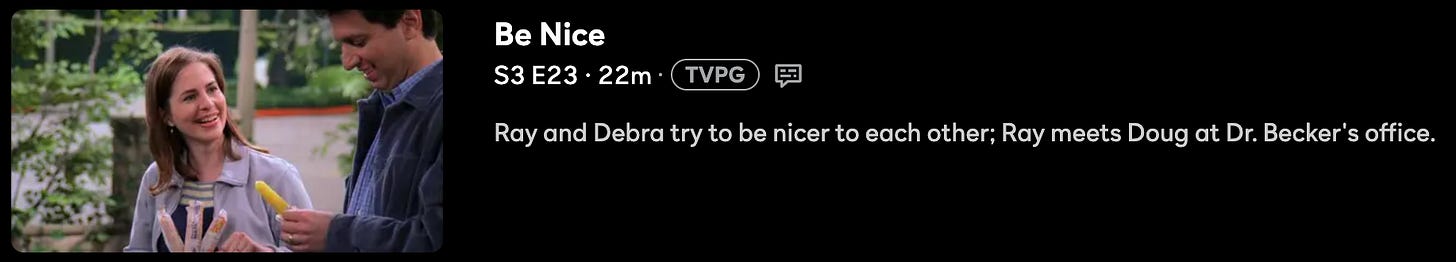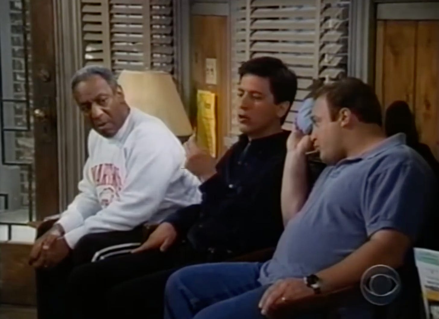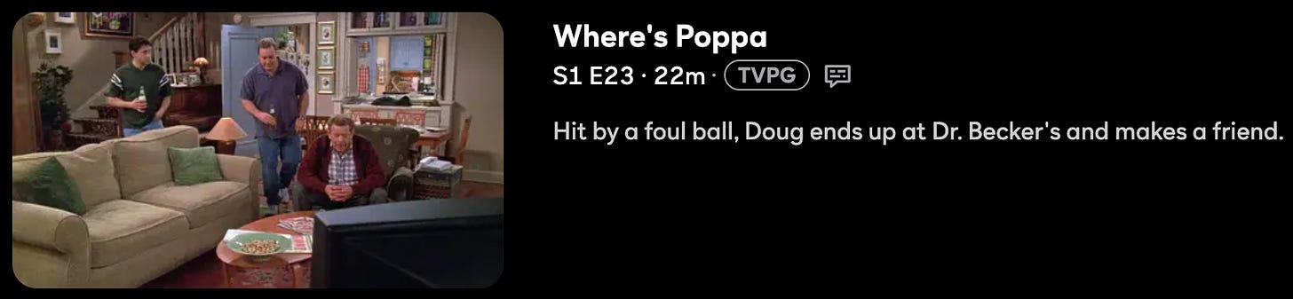 At the end of Cosby, Hilton winds up at Dr. Becker’s office. At the end of an otherwise irrelevant episode of The King of Queens, Doug winds up there, too. (Case in point: Doug was hit by a foul ball at a baseball game—something that wasn’t a part of the episode at all.) Cosby’s Hilton is still there, confirming that this waiting room narrative has its own timeline. At the end of Everybody Loves Raymond—again a completely separate narrative—Ray shows up at Dr. Becker’s as well, chatting it up with his pal Doug.