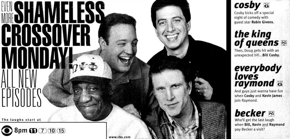 In 1999, CBS hoped to drum up viewership for sweeps with a four-show stunt: cross-pollinating its entire Monday night comedy lineup. But while two of those shows remain some of the most syndicated sitcoms today, the results of the crossover between The King of Queens, Everybody Loves Raymond, Becker, and Cosby went missing from history following their broadcast.